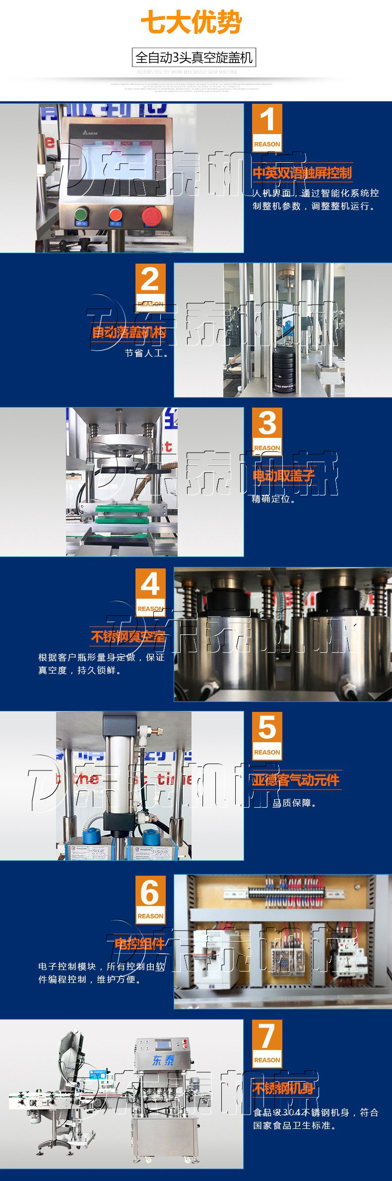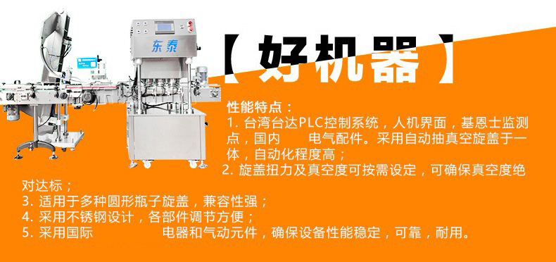 1.臺灣臺達(dá)PLC控制系統(tǒng),人機界面,基恩士檢測點,國內(nèi)電氣配件。采用自動抽真空旋蓋于一體,自動化程度高;