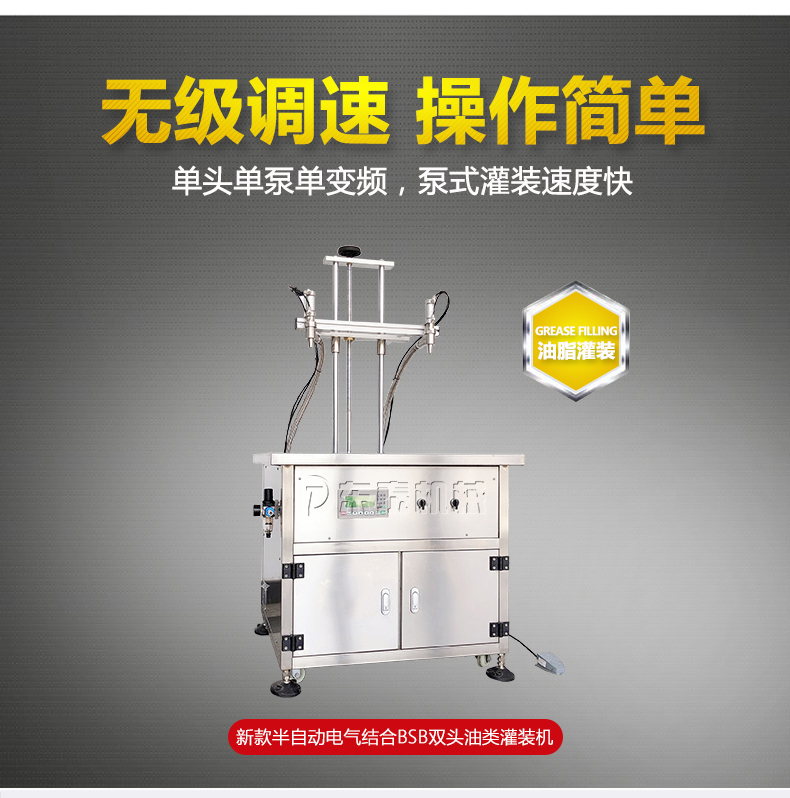 半自動雙頭食用油灌裝機主要是應(yīng)用于各種食用油、潤滑油等粘稠液體的定量灌裝,如花生油,大豆油,菜籽油、香油,潤滑油等油類的灌裝。還擁有這先進的定量灌裝技術(shù),結(jié)合了微電子智能控制技術(shù)有著單頭單變頻控制系統(tǒng),實現(xiàn)高精度、無級調(diào)速,操作方便。兩個灌裝頭能夠在一定的范圍內(nèi)隨意調(diào)節(jié)間距和灌裝量,能夠使用多種大小形狀的容器的灌裝。自動化程度高。另外,半自動雙頭食用油灌裝機的機身零件選用的事優(yōu)質(zhì)不銹鋼,耐用又衛(wèi)生,長時間工作性能可靠穩(wěn)定。本公司產(chǎn)品通過了IS9000質(zhì)量體系認證。設(shè)備經(jīng)久耐用,性能穩(wěn)定,是食用油、潤滑油等行業(yè)理想的灌裝設(shè)備。