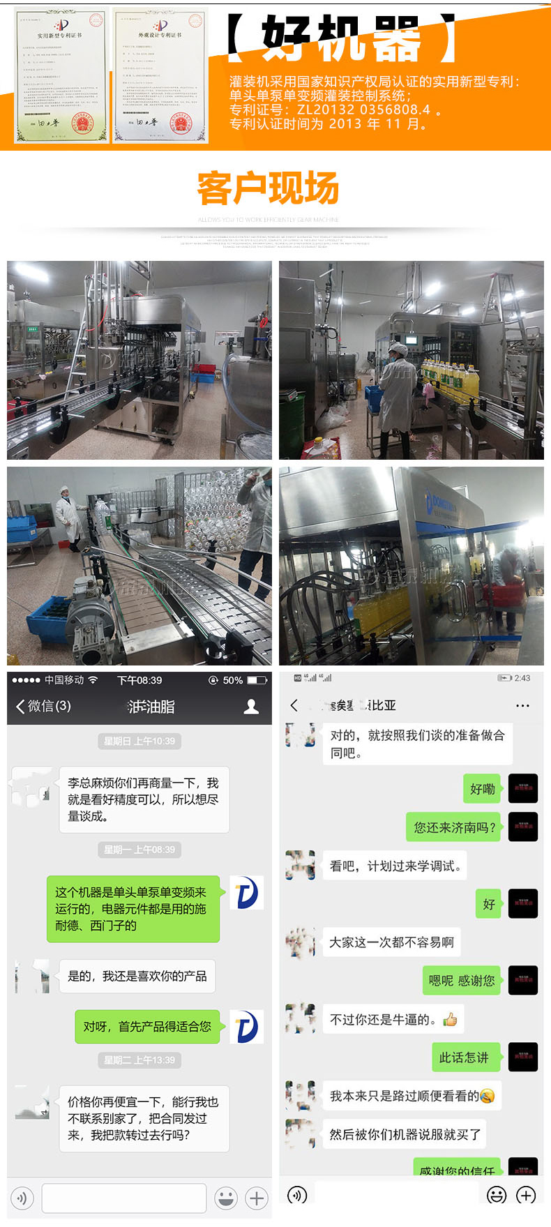 4.全自動(dòng)食用油灌裝機(jī)采用動(dòng)力灌裝,無需配裝高位罐,簡化了安裝工序,降低了生產(chǎn)成本,提高了灌裝效率;